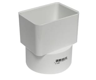 - Installed on a rainwater downspout pipe end to make a smooth transition to a PVC white sewer pipe.